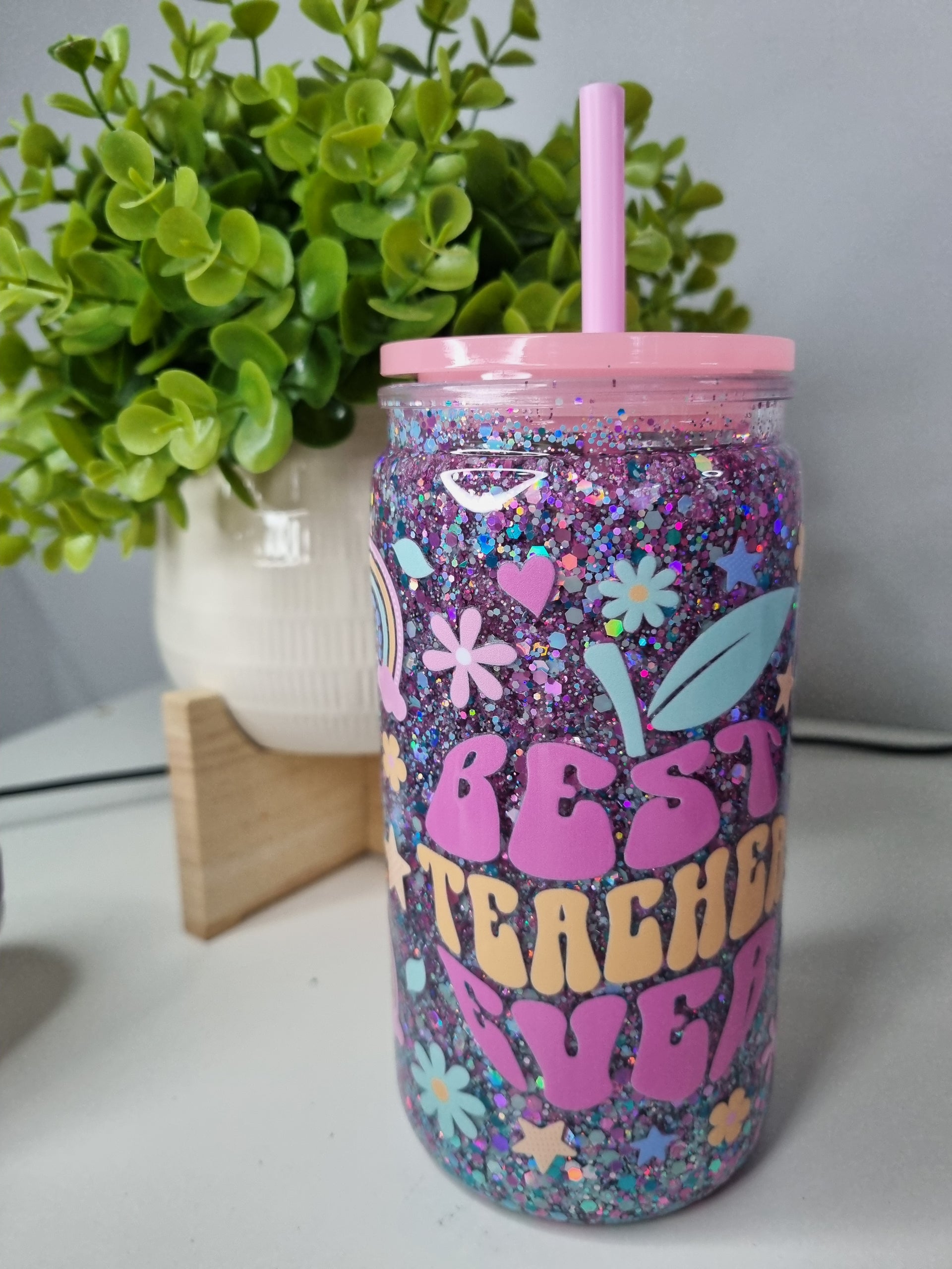 16oz Snow Globe Cup, with Best Teacher Ever and stunning mixed glitters, design ready for it's new home or to be gifted to your child's favourite Teacher to show your appreciation πΒ