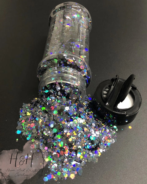 Charcoal Chunky Holographic Glitter 50gram easy poor bottle.