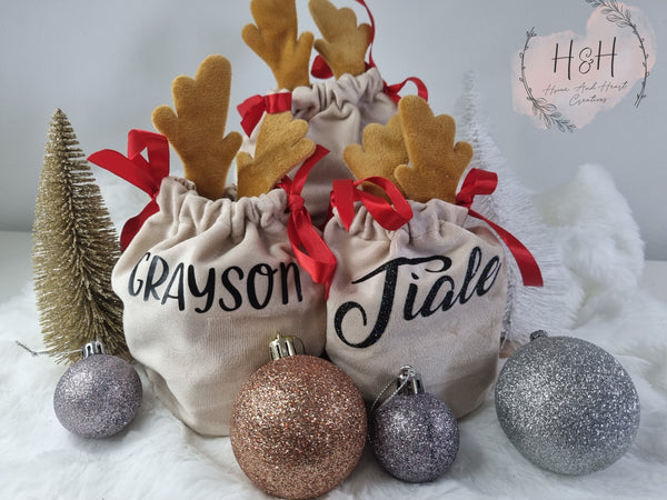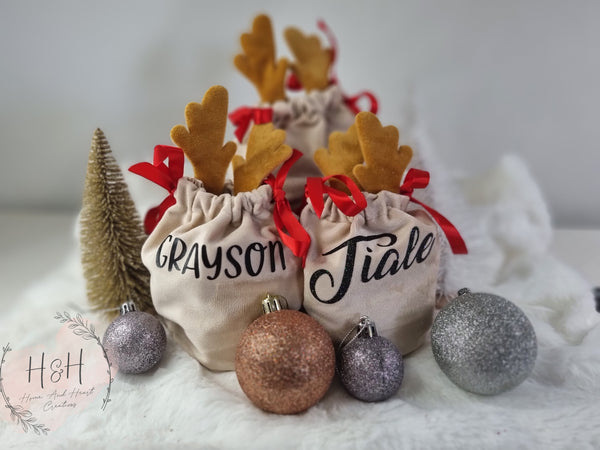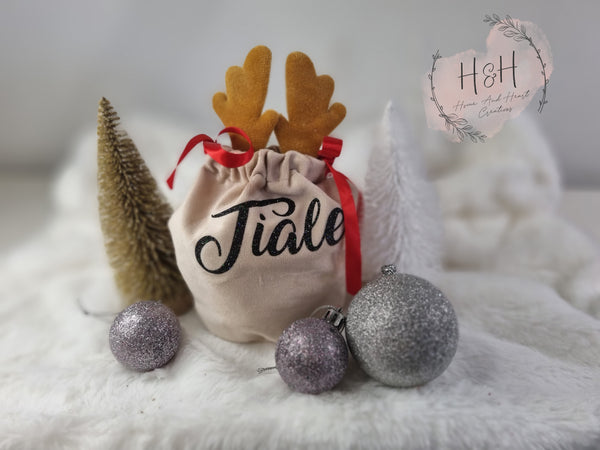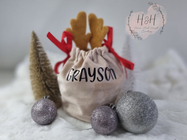 Velvet cloth Reindeer Christmas drawstring bag with cute reindeer ears detail.Β