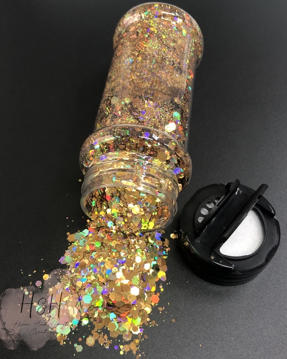 Gold Chunky Holographic Glitter 50gram easy poor bottle.